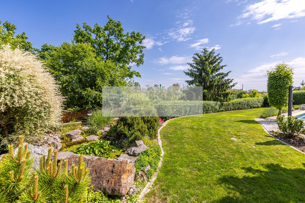Za domem se rozkládá vzrostlá a pečlivě udržovaná zahrada, se zahradním altánem a druhou terasou, na kterou navazuje zahradní jezírko.. Najdete zde venkovní vyhřívaný bazén, ideální pro osvěžení během horkých letních dnů nebo pro večerní plavání pod hvězdami, zahradní altán s terasou, okrasné zahradní jezírko a různá zákoutí pro odpočinek.