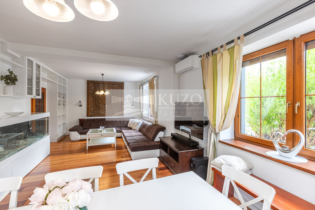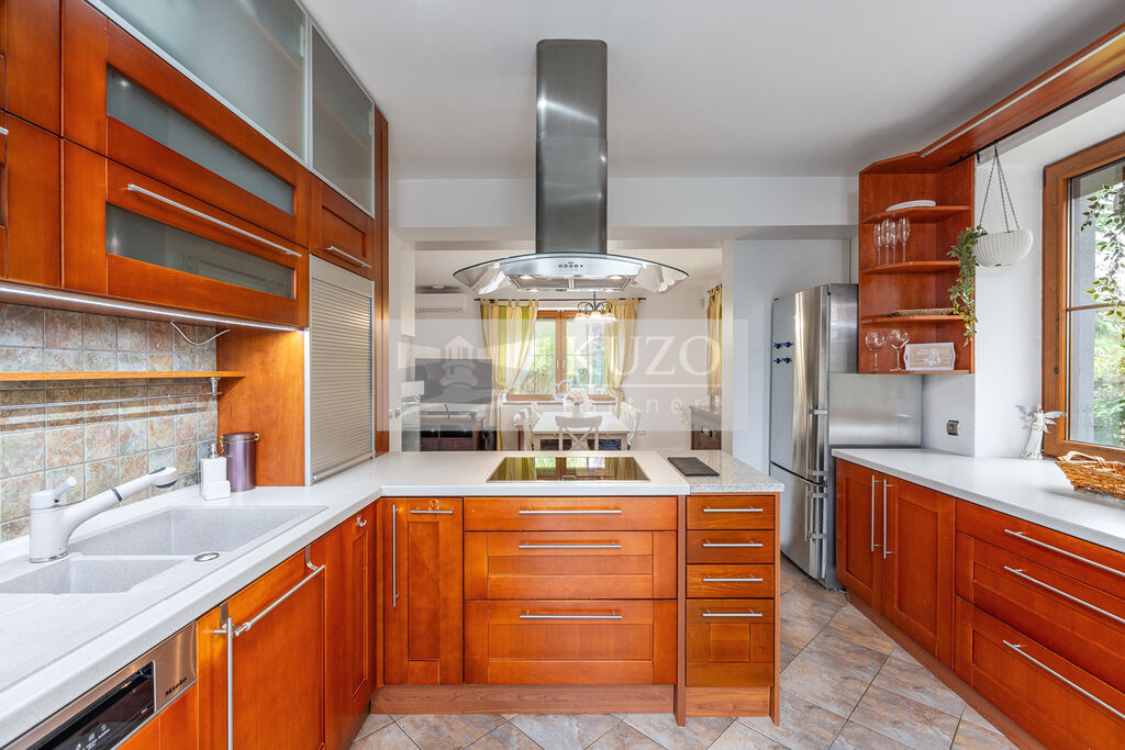 Na prostorný obývací pokoj s kuchyňským koutem plynule navazuje vytápěná zimní zahrada, která nabízí ideální prostor pro odpočinek během celého roku – ať už si užíváte ranní kávu, nebo večerní posezení s výhledem do zahrady.