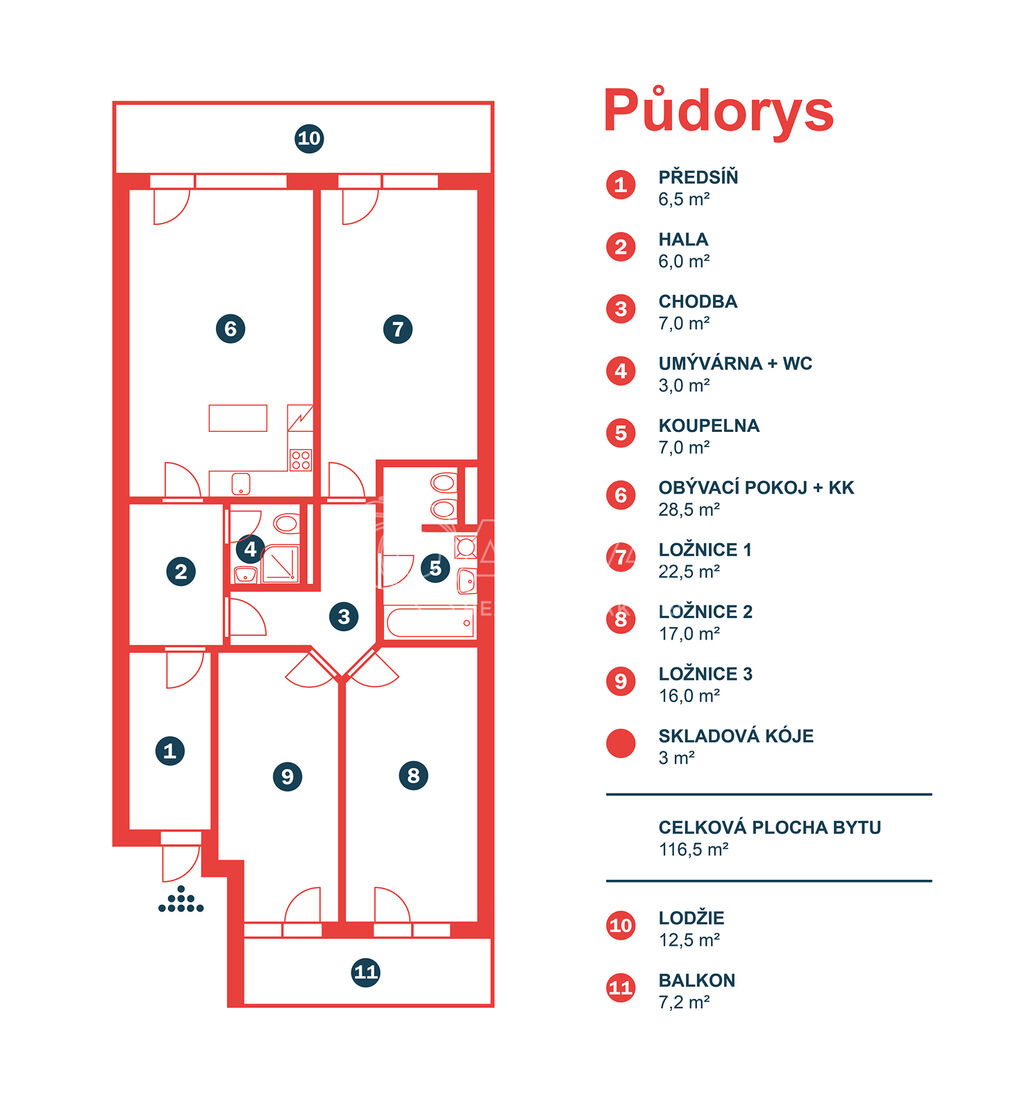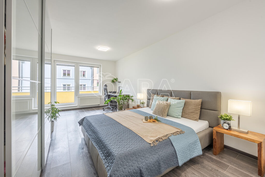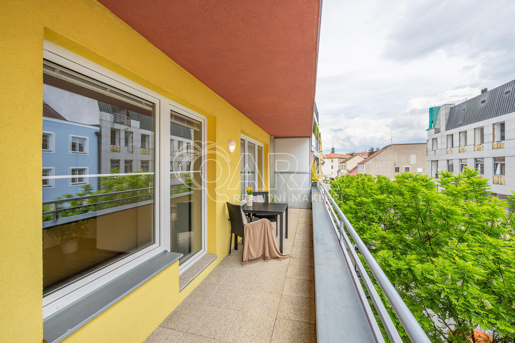 Byt o celkové výměře 136,2 m2 (vnitřní plocha 113,5 m2, balkon 7,2 m2, lodžie 12,5 m2) je výjimečně dobře dispozičně řešen a sestává ze vstupní chodby, obývacího pokoje s kuchyňským koutem, 3 ložnic, koupelny se sprchovým koutem a WC, chodby a koupelny s vanou a s WC. Z obývacího pokoje a ložnice je možný vstup na jižně orientovanou lodžii, ze dvou dalších ložnic pak je vstup na severně orientovaný balkon. V celém bytě je položena plovoucí podlaha, v předsíni a v koupelnách je dlažba. Vytápění zajišťuje centrální plynová kotelna v domě. Měsíční poplatky za byt jsou 3 995,- Kč + zálohy na elektřinu. Dům je vybaven výtahem. V suterénu domu jsou garáže vybavené kamerovým systémem, kde je možnost pronajmout si garážové stání.
