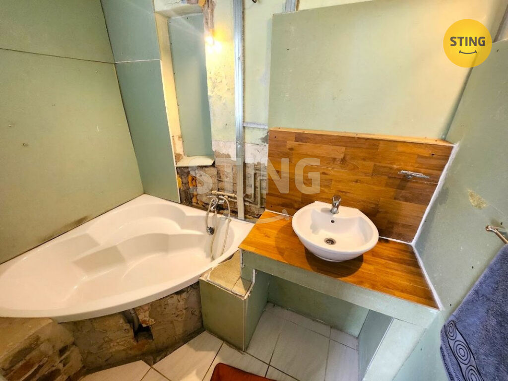 * K ložnici náleží koupelna se započatou rekonstrukcí, vybavená rohovou vanou a umyvadlem