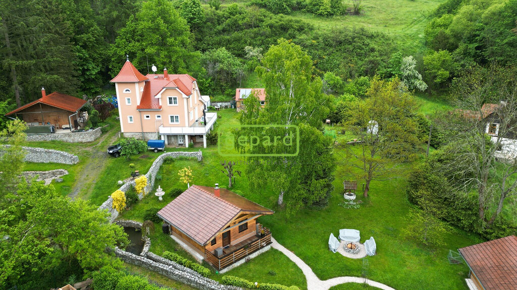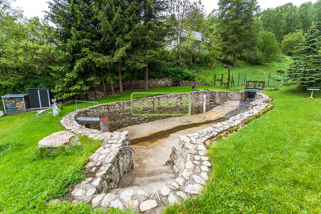 Mírně svažitý pozemek, kompletně oplocen, masivní kamenné opěrné zdi, regulovaný potok s jezírkem, koupací rybníček.