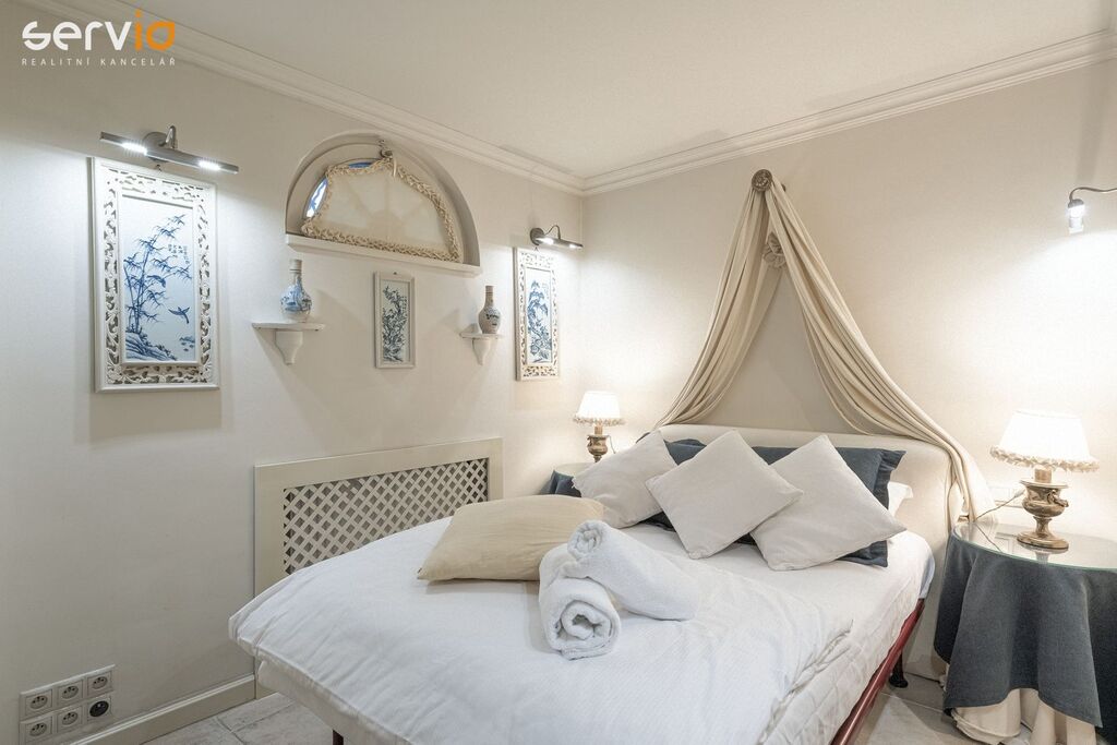 3.NP: Apartmán o velikosti 2+1, 2 x ložnice, 1 x se vstupem do místnosti s umyvadlem, druhá ložnice má navíc šatnu a samostatné WC, dále prostorný obývací pokoj s krbem, koupelna se sprchou a menší kuchyňka, podlaha: dlažba, videotelefon, TV, klimatizace, kompletní stylové vnitřní vybavení včetně vestavěných úložných skříní.