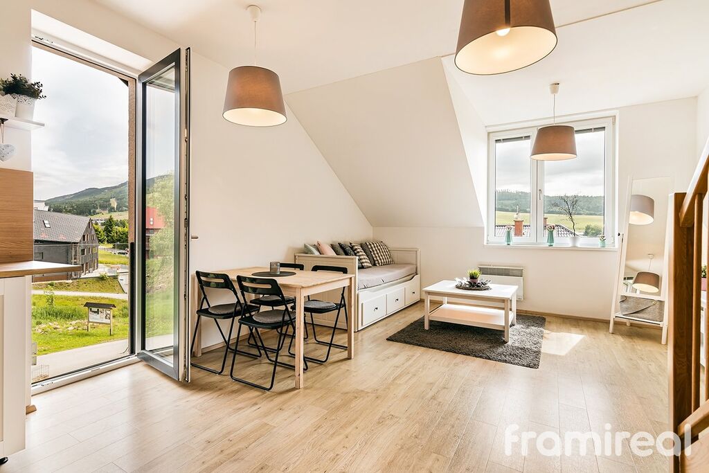 Nemovitost se nachází ve 2. patře horského domu a nabízí komfortní zázemí pro celoroční pobyt. Vstupní chodba disponuje praktickými úložnými prostory, odkud se vstupuje do koupelny se sprchovým koutem a toaletou. Obytná část spojuje kuchyňský kout s jídelním stolem, rozkládací pohovku s TV a komodu. Masivní dřevěné schodiště vede do podkrovní ložnice s manželskou postelí, komodou a druhou koupelnou s toaletou.
