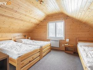Zastavěná plocha chaty činí 94 m2, užitná plocha 110 m2, celková plocha pozemku 803 m2. Dispozičně je chata řešena jako 4+1, z toho 3+1 v přízemí, kde se nachází dvě ložnice, obývací pokoj s krbem, kuchyň s barem a koupelna s WC. Ve 2.NP je poslední pokoj (až 5 lůžek) a koupelna s WC. Vytápění zajišťují lokální elektrické přímotopy. Na pozemek je zaveden obecní vodovod, ale nyní se používá primárně pitná voda ze studny, napojení na kanalizaci a na novou nedalekou čističku odpadních vod. Venkovní zastřešené posezení. Chata se prodává včetně vybavení na foto. V ceně jsou zahrnuty 2 parkovací stání a v případě zájmu je možné dokoupit navíc až další 3 parkovací stání (1 PS za 150 tis. Kč).