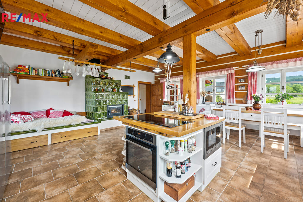 Dominantou chalupy je prostorná světnice, jejímž srdcem jsou ručně stavěná kachlová kamna s možností spaní na samostatně vyhřívané lavici (peci). Toto oblíbené místo všech návštěvníků nabízí příjemné teplo sálajícího ohně a pohádkovou atmosféru. Interiér je citlivě sladěný do posledního detailu. Nádherný strop z bílých palubek s přiznanými dřevěnými trámy podtrhuje kouzlo tradiční řemeslné práce a dřevěné prvky navozují útulnou a příjemnou atmosféru.