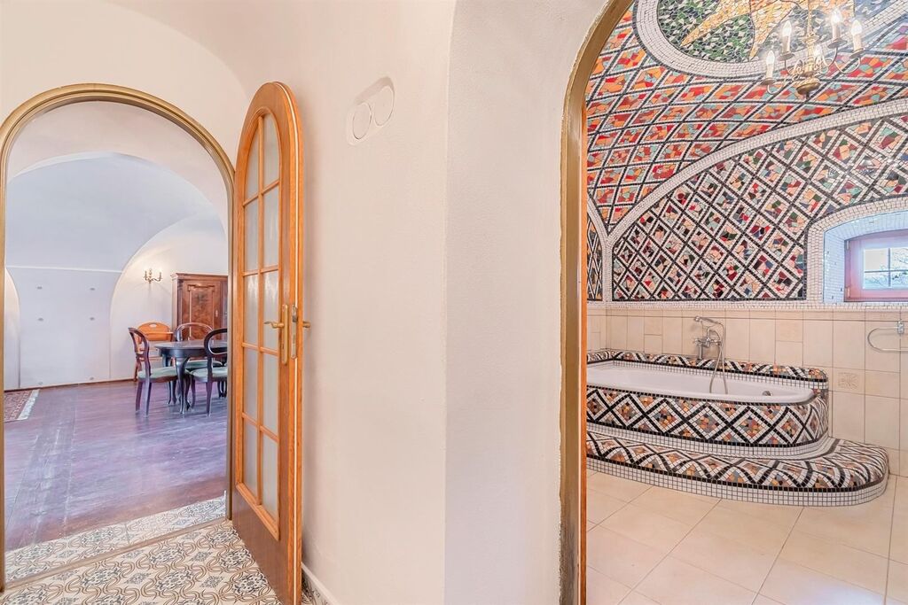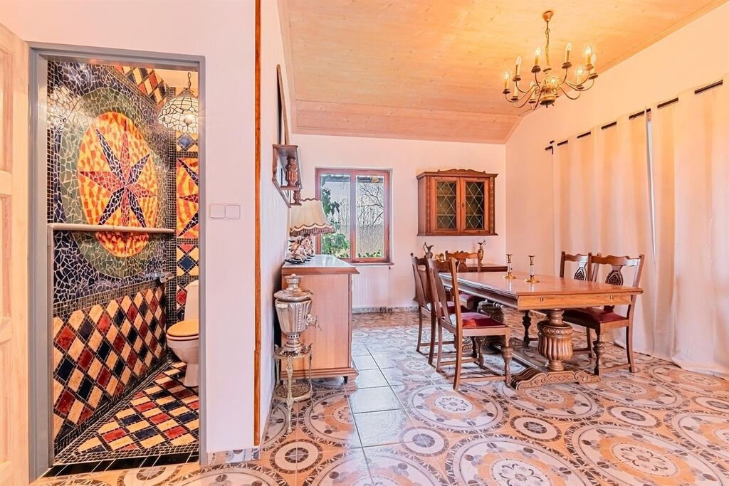 Ve víceúčelovém prostorném domě s úžasnou atmosférou, který po rekonstrukci působící jako šlechtické sídlo, malý zámeček, je veškeré zázemí k využití jak pro rekreační účely, tak i pro trvalé bydlení větší rodiny, společenství. V dispozičně prakticky řešeném dobře prosvětleném domě jsou pokoje ubytovací i velké společenské prostory, v přízemí vše připraveno pro velkou jídelnu, kavárnu, s úpravami využitelnou i jako restauraci. Prostoru pro kavárnu, restauraci, dominuje otevřený renovovaný krb, připravený i na možné vsazení dvouplášťové krbové vložky.