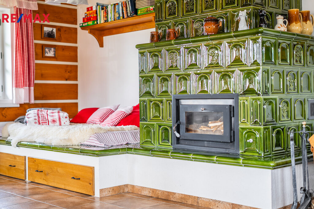 Dominantou chalupy je prostorná světnice, jejímž srdcem jsou ručně stavěná kachlová kamna s možností spaní na samostatně vyhřívané lavici (peci). Toto oblíbené místo všech návštěvníků nabízí příjemné teplo sálajícího ohně a pohádkovou atmosféru. Interiér je citlivě sladěný do posledního detailu. Nádherný strop z bílých palubek s přiznanými dřevěnými trámy podtrhuje kouzlo tradiční řemeslné práce a dřevěné prvky navozují útulnou a příjemnou atmosféru.