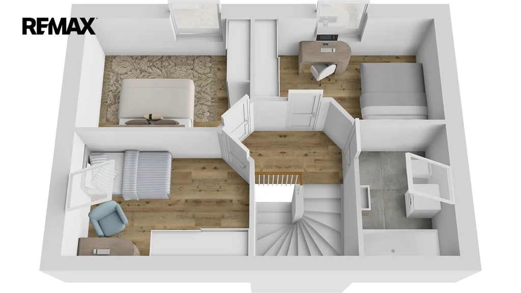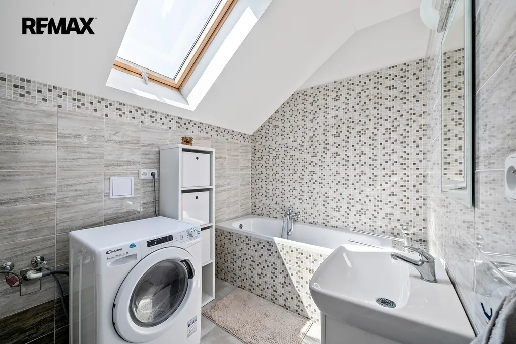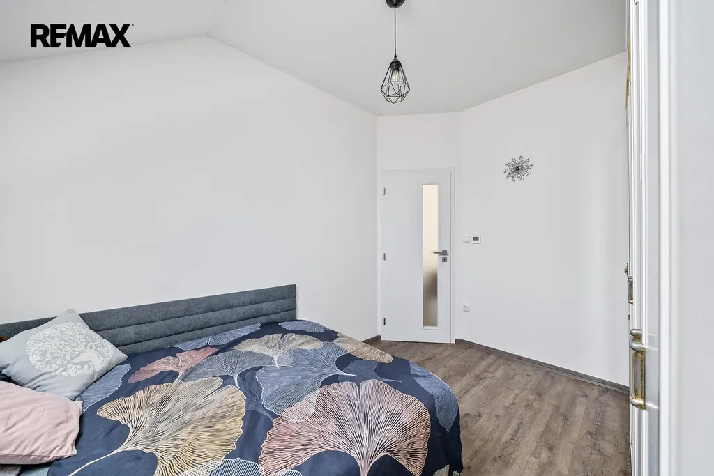 Druhé podlaží disponuje 3 samostatnými pokoji, chodbou, prostornou koupelnou vybavenou vanou, toaletou a pračkou. Po výsuvných schodech se dostanete do půdních prostor.