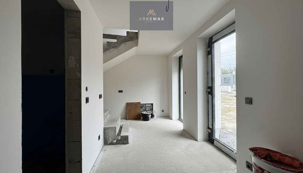 schodišti do prvního mezaninu, kde bude prostorný obývací pokoj s kuchyňským koutem, který má velkolepých 40 m2, s výstupem na východně orientovanou terasu a zahradu. Vysoký strop (4m) v obývacím pokoji o výšku mezaninu. Ze zádveří vede schodiště do