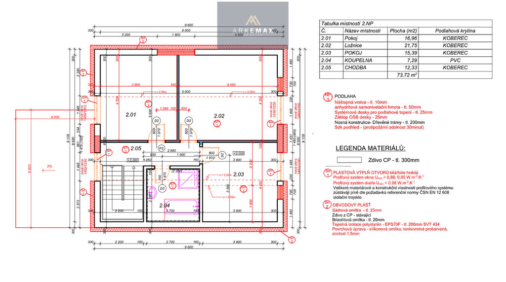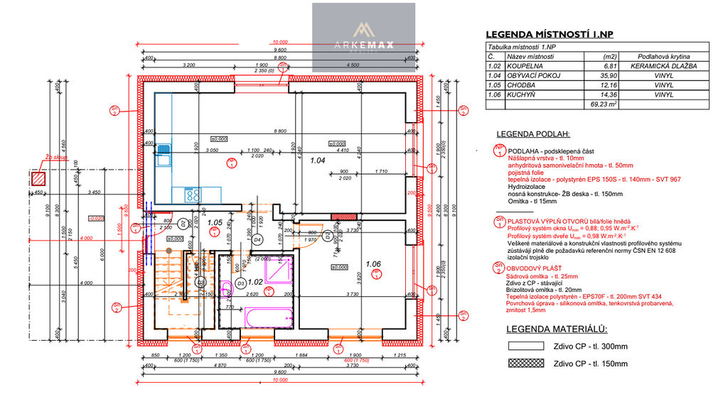 Dům bude postaven z cihlových tvárnic a kompletně zateplený. Střecha sedlová s plechovou krytinou. Okna jsou navržena jako plastová 5-tipolohová, 6-ti komorová s izolačním trojsklem. Objekt bude vytápěn pomocí tepelného čerpadla a jako otopné medium bude voda v podlahovém rozvodu. Odpad je řešen kanalizací.