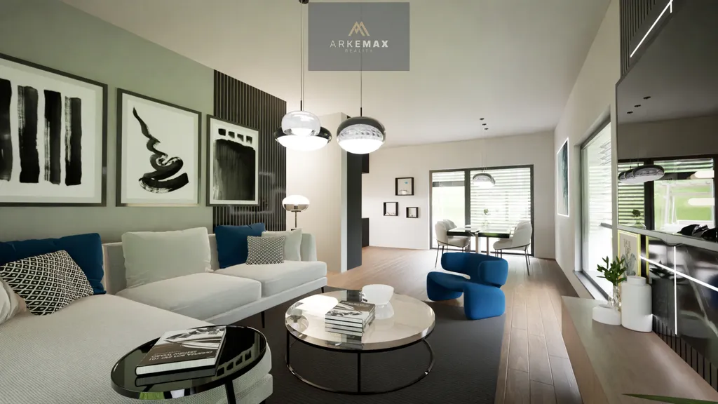 Přízemí domu bude tvořeno vstupní chodbou přecházející do otevřeného obývacího pokoje s kuchyní, jídelní zóna a