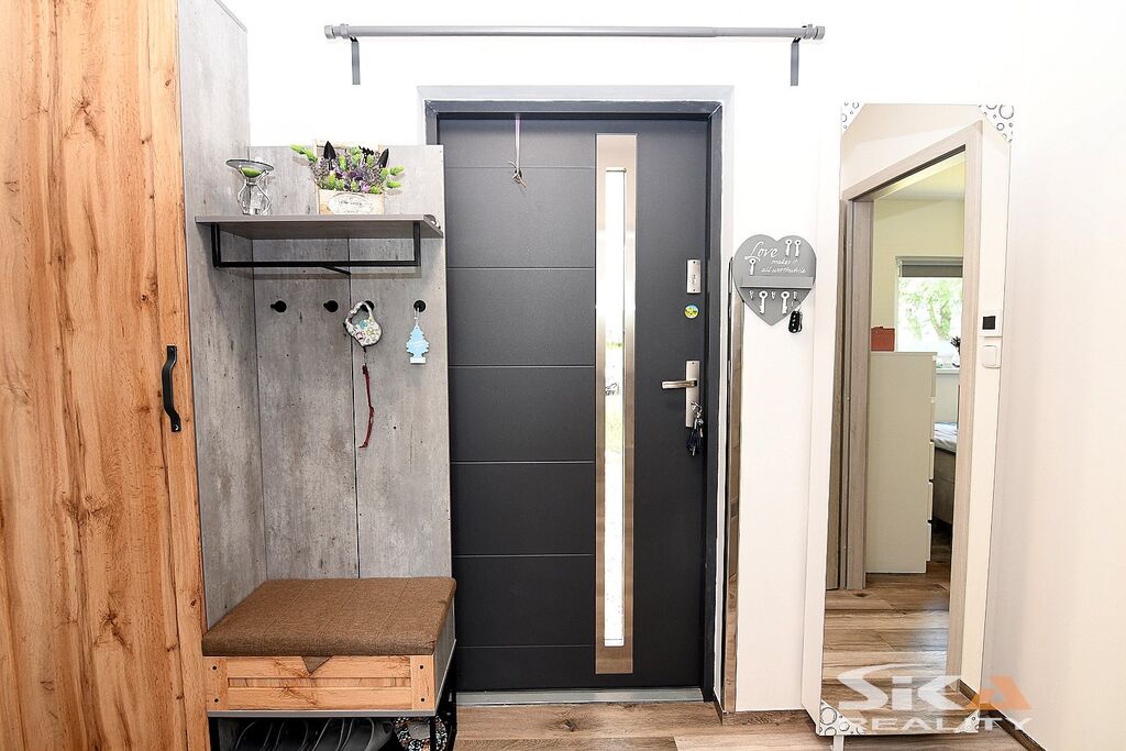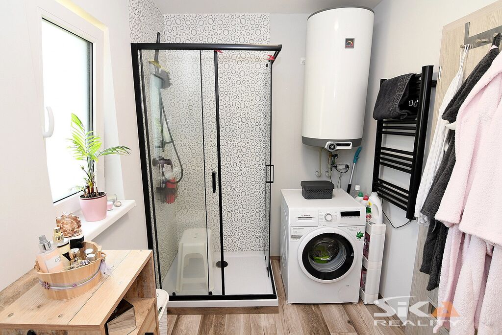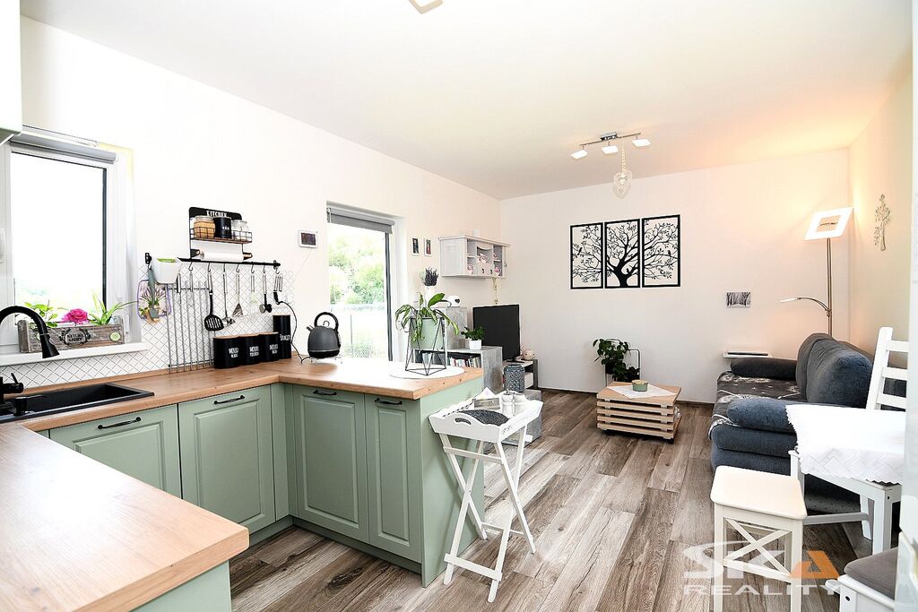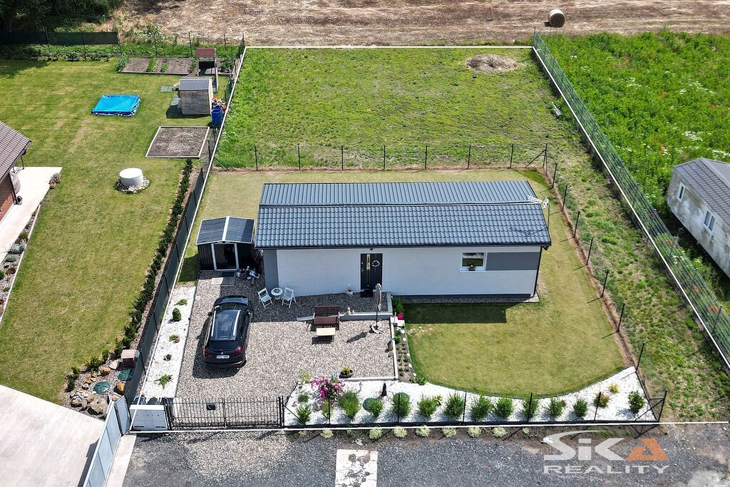 Nabízíme exkluzivně k prodeji novostavbu domu, která je postavena na pozemku obdélníkového půdorysu o celkové zapsané výměře 892 m2 nacházející se v okrajové části obce Cítoliby u Loun. Stavba domu je situována u západní hranice pozemku, má zastavěnou plochu 51 m2, dispoziční řešení 2+kk a celkovou podlahovou plochu cca 40m2. Jedná se o montovanou stavbu typového modulového domu „Český dům“, umístěnou na betonových patkách, která má zřízeny přípojky elektrické energie, obecního vodovodu a kanalizace (přetlaková). Dům má sedlovou střechu, plastová okna s izolačními trojskly s vnitřními zatemňovacími roletami, vytápění objektu je zajištěno stropními topnými fóliemi Heatflow s oddělenou regulací pro každou místnost, v koupelně instalován topný žebřík, ohřev teplé užitkové vody elektrickým bojlerem. Na podlahách vinylová krytina, obložkové zárubně, kuchyňská linka do tvaru písmene „U“ s vestavěnými spotřebiči – elektrická trouba, myčka, digestoř, samostatně stojící indukční varná deska. Dům je umístěn v klidné rezidenční okrajové části obce s množstvím zeleně. Městys Cítoliby se nachází přibližně 3 km od centra města Louny. V obci je základní občanská vybavenost jako mateřská a základní škola, obchod, lékař. Výborné dopravní napojení na dálnici D7. Vzhledem ke skutečnosti, že nebyl předložen PENB, uvádíme třídu energetické náročnosti „G“. Další informace rádi poskytneme v RK.