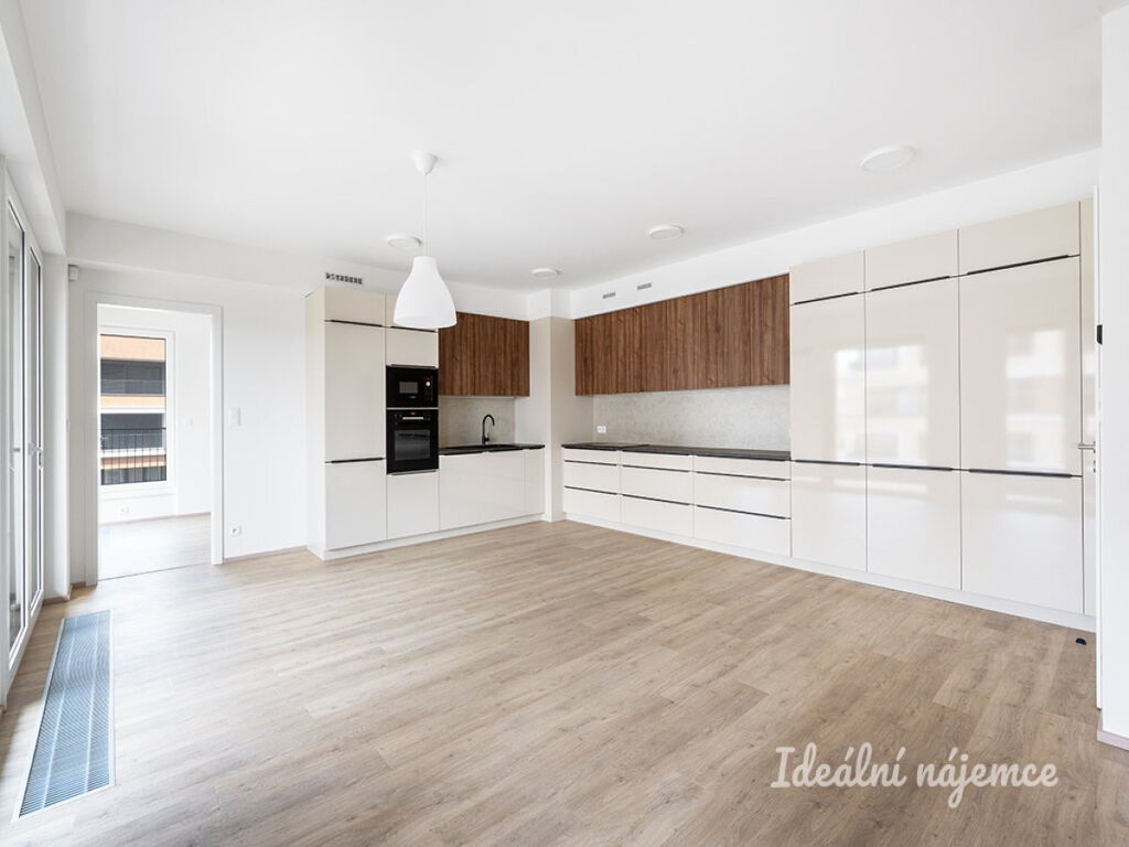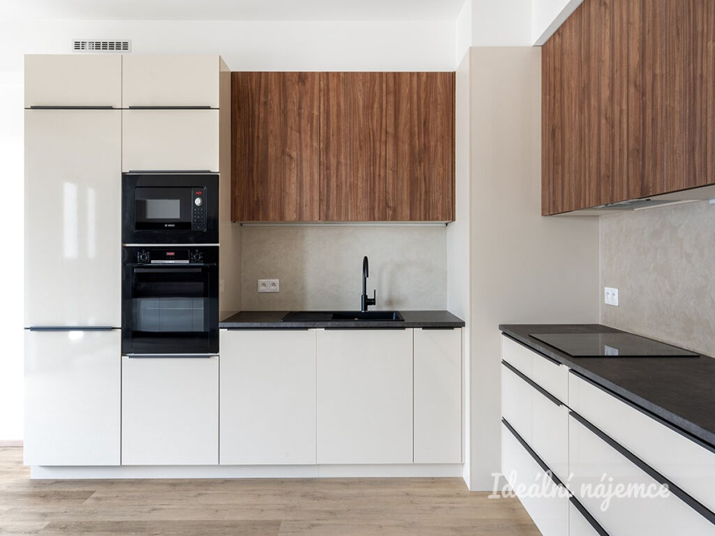 Byt o dispozici 3+kk má celkovou výměru 90 m² a je velmi prakticky řešený. Nabízí světlý obývací pokoj s kuchyňským koutem o velikosti 33 m², kde se nachází vkusná a prostorná kuchyňská linka s elektrickou troubou, mikrovlnnou troubou, myčkou nádobí, nadstandardně velkou pracovní plochou a obrovským množství úložného prostoru. Další úložné prostory nabízí nábytek na míru v obývací části. Na oknech jsou předokenní rolety s dálkovým ovládáním.