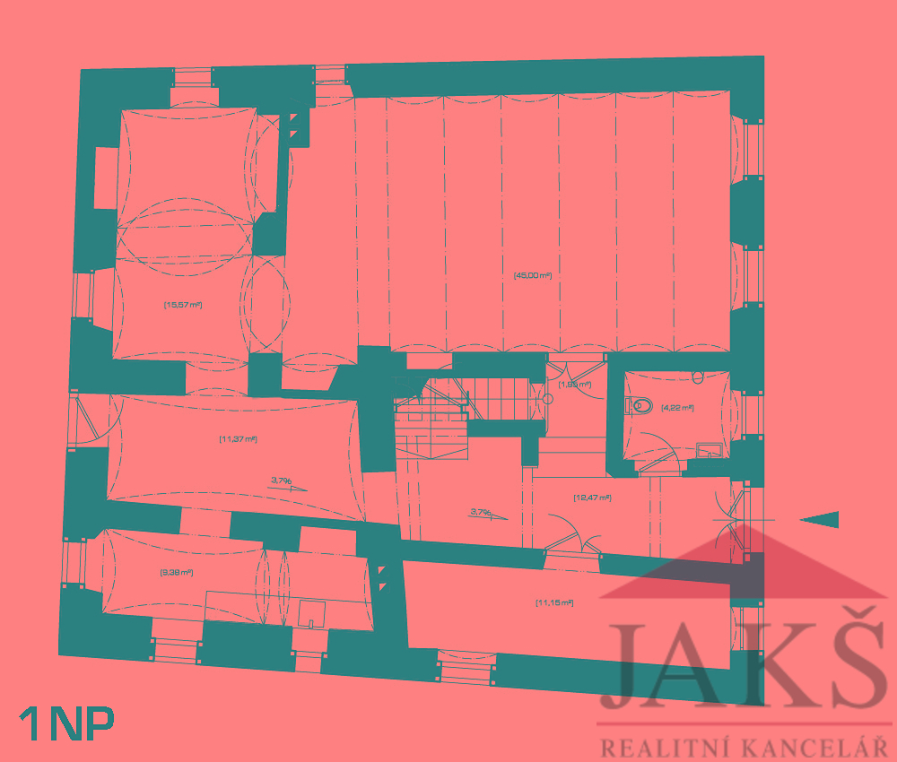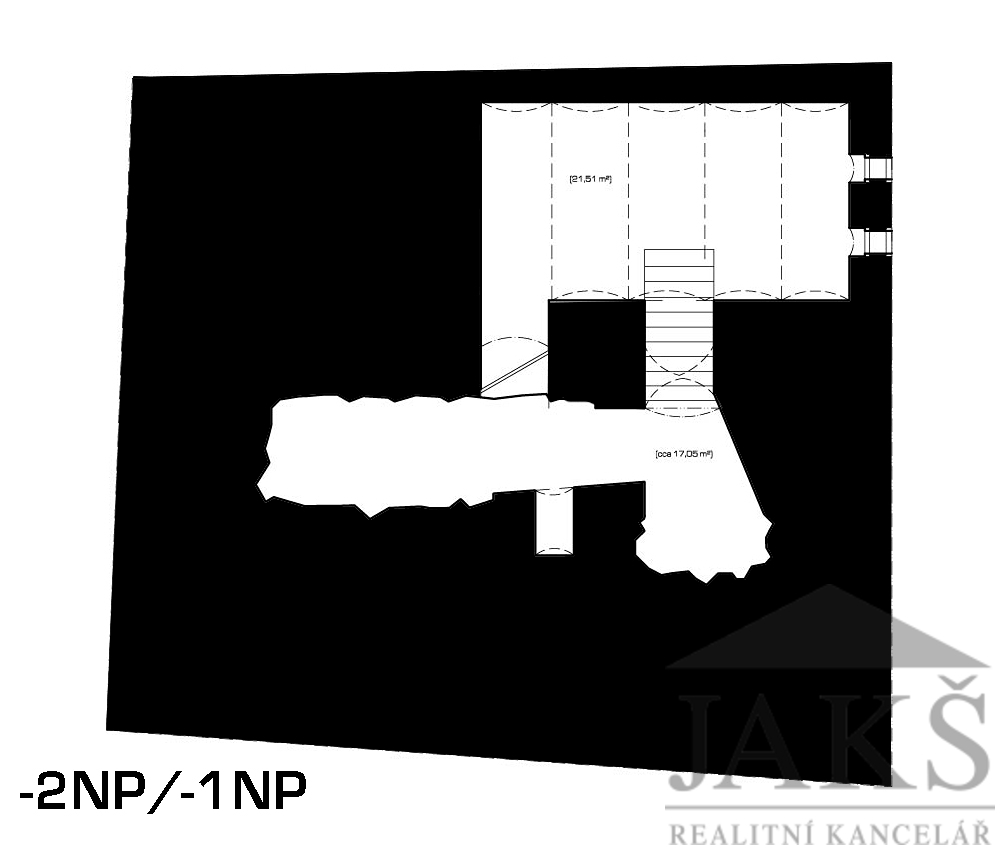 Popis: suterén (38,56 m2): část. podsklepeno (dvoupodlažní sklepy); 1.NP (111,11 m2): centrální chodba 25,79 m2 se vstupem na dvorek a schodištěm do 2.NP, WC s umyvadlem 4,22 m2, místnost 11,15 m2, prostorný obchodní prostor 45 m2 (nyní grafické studio), zasedací místnost/jídelna 15,57 m2, kuchyně 11,37 m2 (kuch. linka); 2.NP (109,17 m2): chodba 12,3 m2, koupelna (sprchový kout, umyv., WC), 4x místnost (34,42 m2; 23,52 m2; 14,72 m2 a 14,38 m2), sklad 6,22 m2 pod schodištěm do podkroví (123,55 m2): otevřený víceúrovňový prostor 106,64 m2 vybízí k vestavbě mezonetového apartmánu a sklad 16,91 m2.