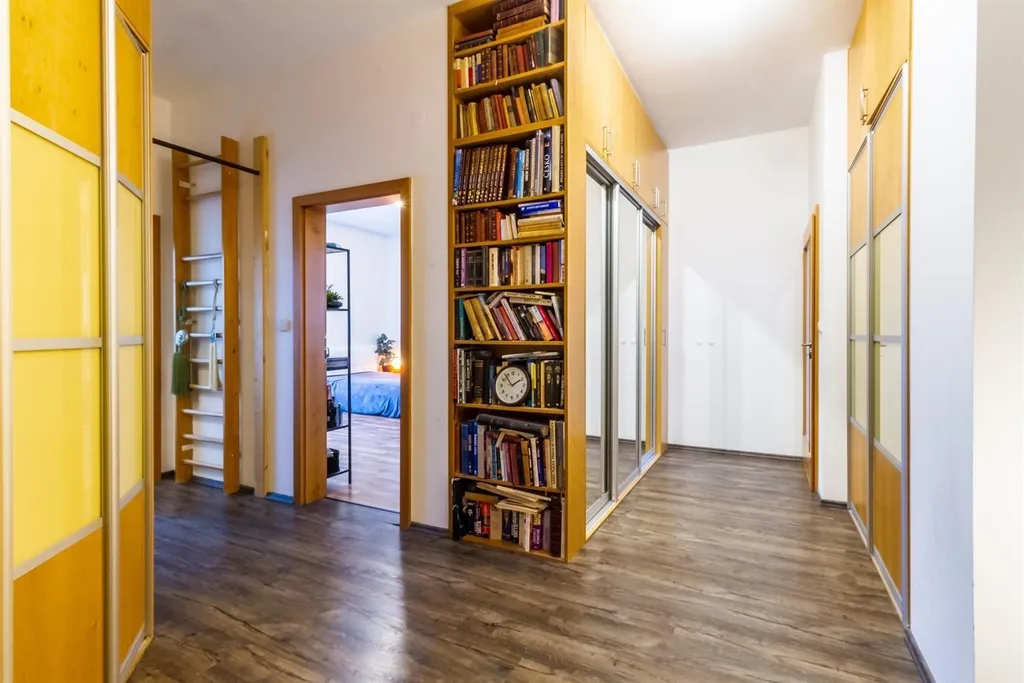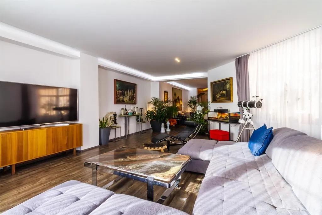 Jedná se konkrétně o kompletně nákladně zrekonstruovanou bytovou jednotku o dispozici 4+kk a celkové podlahové výměře 215 m2 (zahrnuta je i výměra terasy 17,2 m2 a výměra sklepní místnosti 7,2m2). Byt je situován v prvním patře skvěle spravovaného cihlového moderního domu s prostorným výtahem.