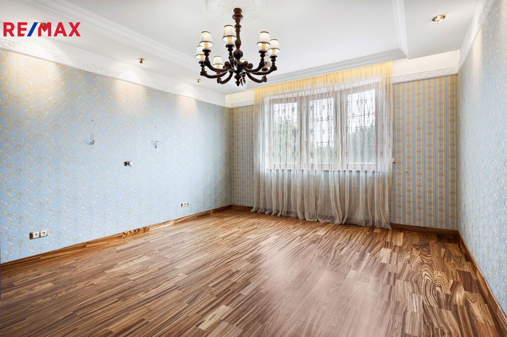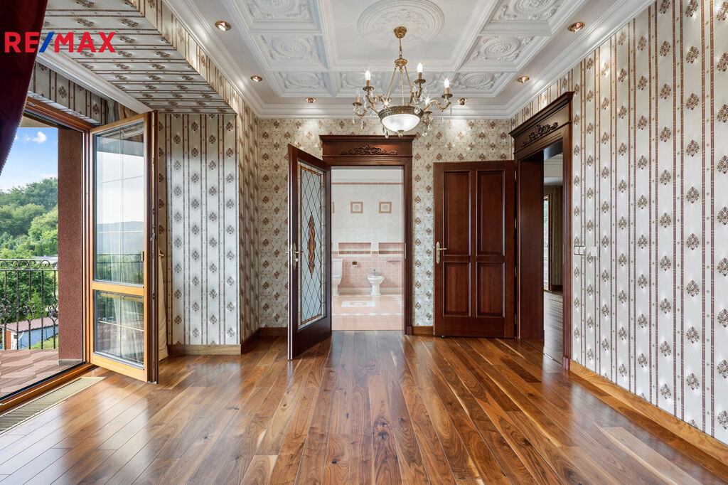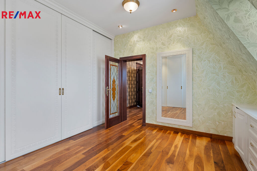 V patře se nachází další elegantní ložnice s balkonem a vlastní koupelnou, pracovna a prostorná šatna – vše s důrazem na komfort a vkus.