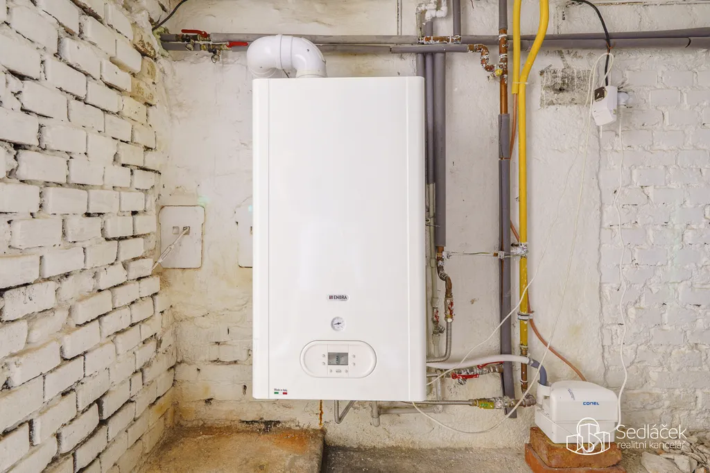 V suterénu je kondenzační plynový kotel Enbra, který zajišťuje úsporné vytápění i ohřev vody.