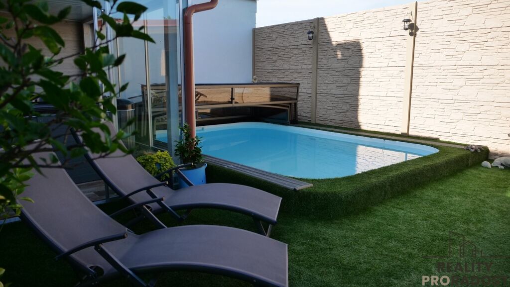 Jedním z největších bonusů této nemovitosti je pečlivě upravený dvůr s prvotřídním zázemím pro relaxaci. Najdete zde klimatizovanou zimní zahradu s posezením a vířivkou pro pět osob, bazén se slanou vodou (nové zastřešení a svařovaná fólie z roku 2024), útulnou finskou saunu a také funkční udírnu.