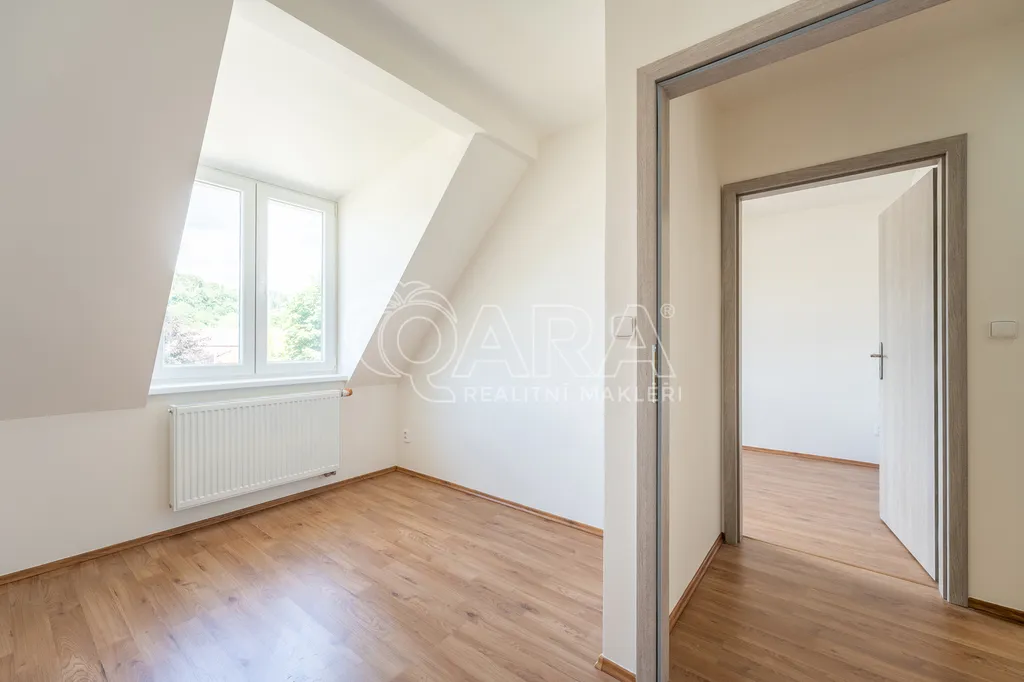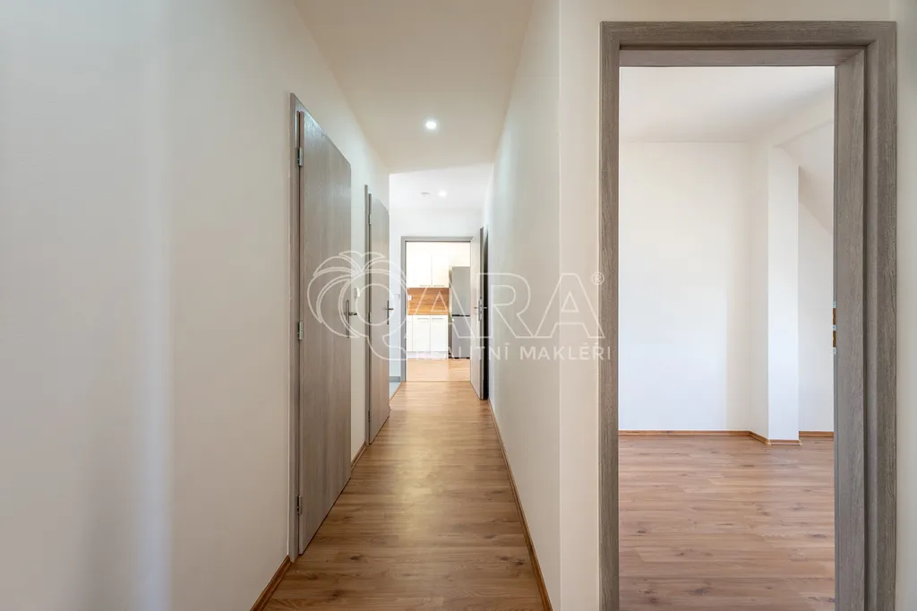 Bytová jednotka o podlahové ploše 63 m² se nachází ve 2. nadzemním podlaží cihlového domu. Skládá se z chodby o výměře 9,95 m², ze které jsou přístupné všechny místnosti, které jsou vzájemně neprůchozí. Kuchyně je spojená s obývacím pokojem a součástí je nová kuchyňská linka se spotřebiči (elektrickou troubou, varnou deskou, digestoří, lednicí s mrazákem i vestavěnou myčkou). V obývacím pokoji je příprava na krbová kamna. Dále jsou k dispozici tři samostatné pokoje. Koupelna je vybavena vanou, umyvadlem se skříňkou a zrcadlem. WC je samostatně.