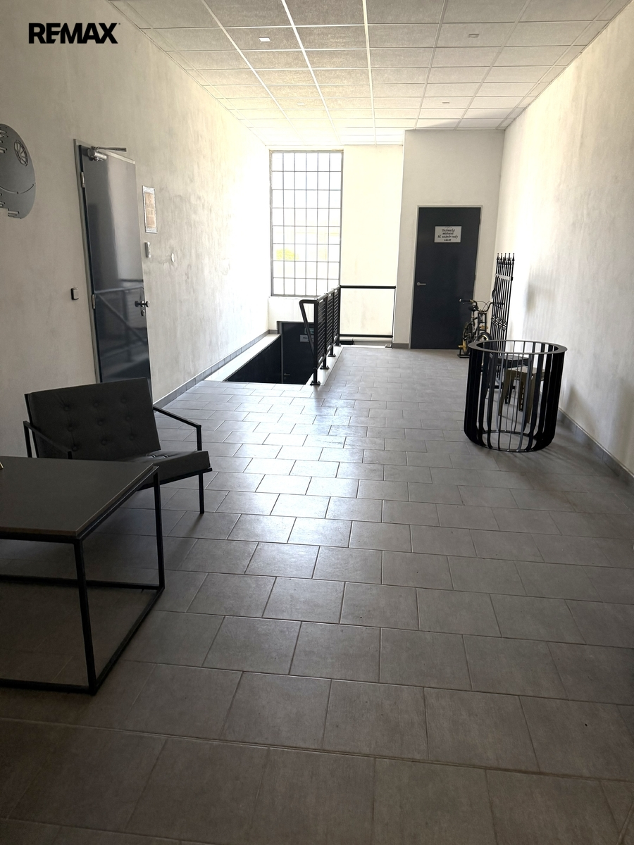 chodba se vstupem přes dveře o výměře 12 m2, kancelář č. 2 o výměře 20 m2, zadní garáž přístupná