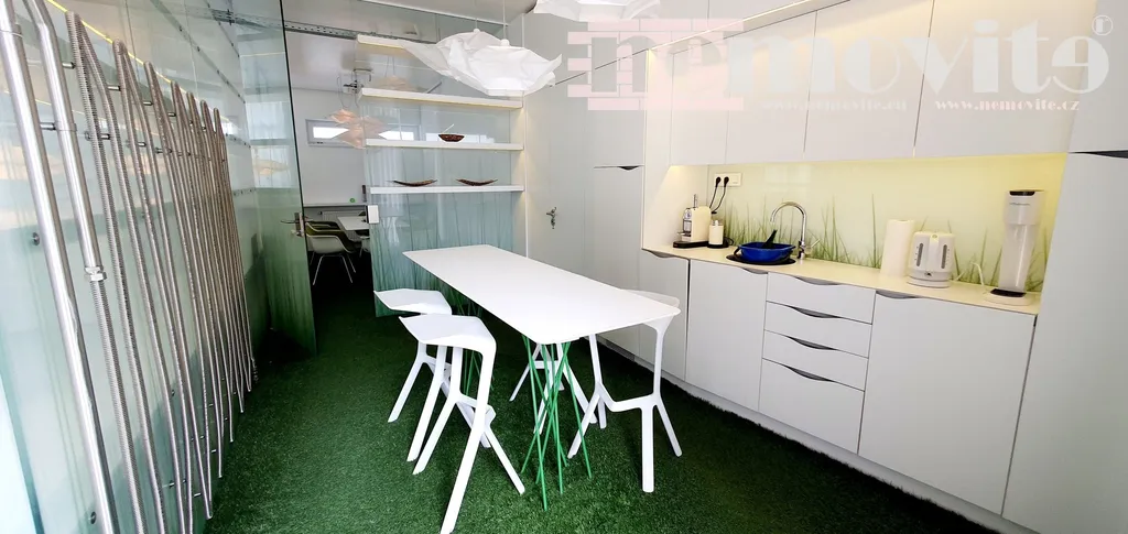 Exkluzivně nabízíme na pronájem kompletně vybavenou luxusní kancelář - Jesenice, Praha západ, možnost pronájmu jednoho parkovacího místa v garážích pod domem, možnost okamžitého používání. Přízemní elektronicky zabezpečená bezbariérová kancelář je vybavena kuchyňkou, jídelním stolem se židlemi, konferenčním stolem se židlemi, jedno oddělené manažerské místo a dvě místa pro pracovníky, 2x klimatizace, myčka, datový projektor s plátnem, lednice, mikrovlnka, toaleta, cena je včetně kompletního vybavení. Bezproblémové parkování u domu v ulici. Vážným zájemcům doporučujeme prohlídku.