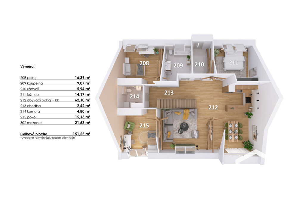 Hlavní obytná část o rozloze 64 m² spojuje otevřený mezonet, obývací pokoj a kuchyňský kout. Výjimečnou atmosféru tohoto prostoru vytváří kombinace minimalistických detailů, industriálního kovového schodiště a hřejivosti přírodních materiálů, jako jsou dřevěné trámy. Pečlivé propojení těchto prvků dodává interiéru nezaměnitelný charakter. Další komfort zajistí tři samostatné ložnice a dvě koupelny s toaletou.