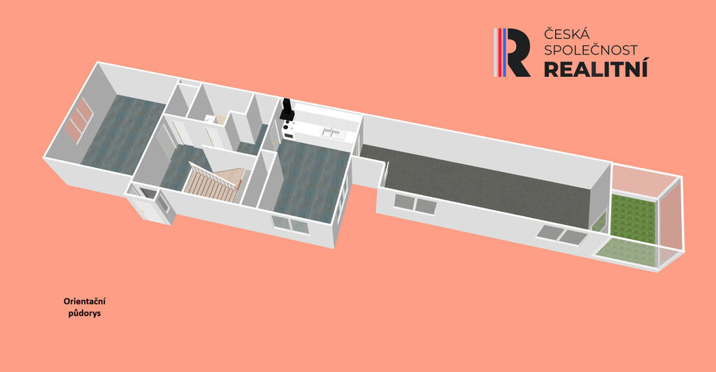 Přízemí: veranda, obývací pokoj, kuchyně, chodba, koupelna s menší vanou a samostatné WC.
