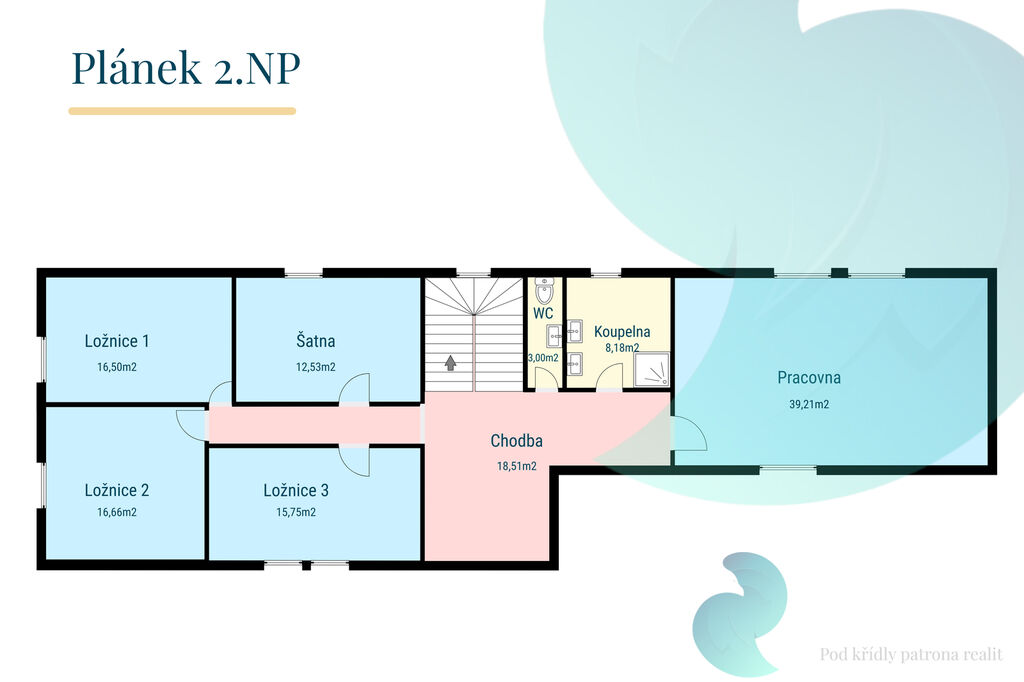 Dispozice domu v přízemí je kuchyně, ložnice, obývací pokoj s krbovou vložkou, koupelna s vanou a sprchovým koutem, samostatné WC, technická místnost, zádveří a komora. V patře jsou 3 ložnice, šatna, koupelna se sprchovým koutem, samostatné WC, velká pracovna 40 m². Vše v plánku ve fotogalerii.