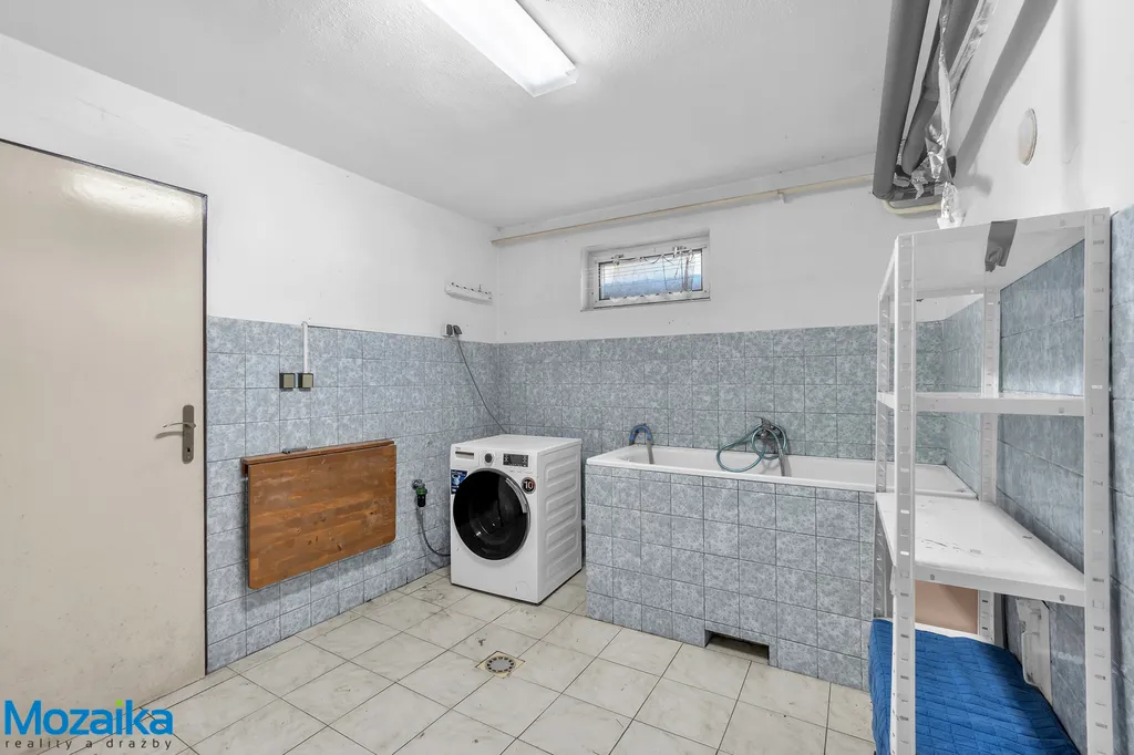 Stavba je z větší části podsklepená , zateplená polystyrenem (10–15 cm). Ve sklepě najdete předsíň, kotelnu s kondenzačním plynovým kotlem BAXI (2020), prádelnu, sklad a technické zázemí s vodárnou napojenou na vlastní studnu a filtrací.