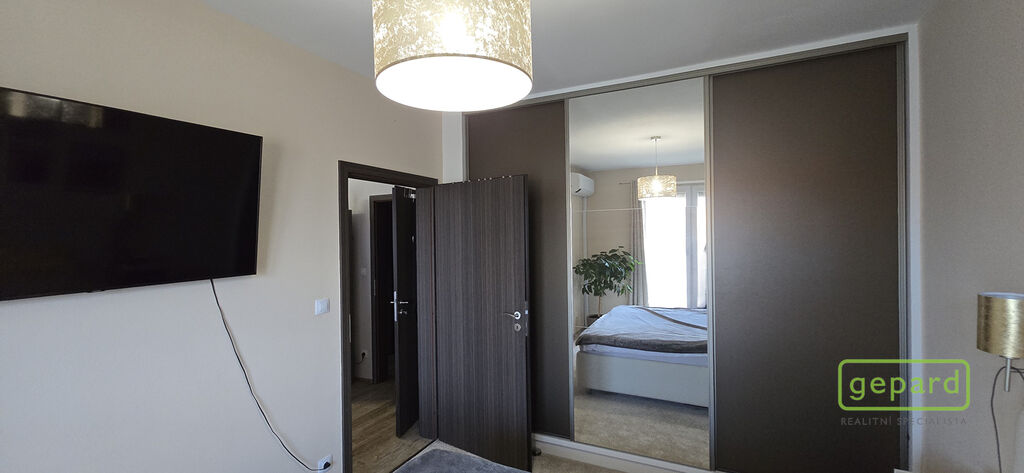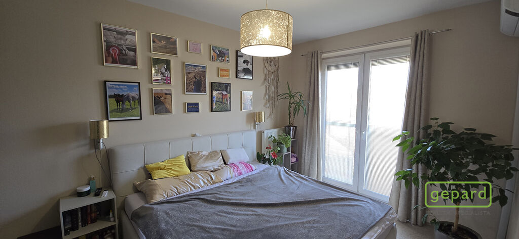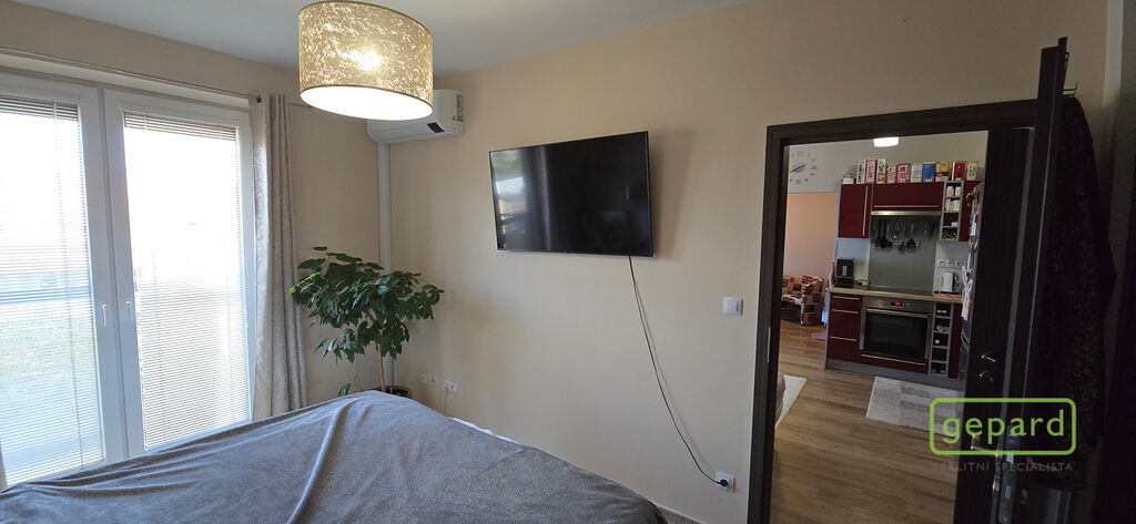 V ložnici jsou francouzské dveře opět s výhledem na okolní krajinu a vnitroblok. V tomto pokoji je nainstalovaná klimatizace, klimatizační jednotka je umístěna v zádveří balkonu.