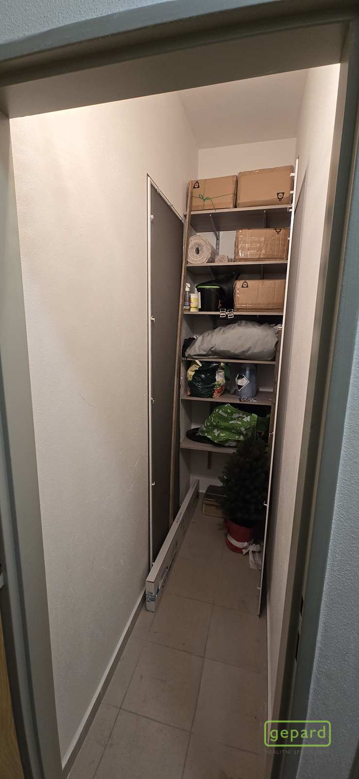Okno má elektricky ovládané předokenní žaluzie. Dále se v pokoji nachází velká vestavná skříň. V tomto pokoji je na podlaze koberec, v ostatních prostorech jsou na podlahách linolea a dlažby.