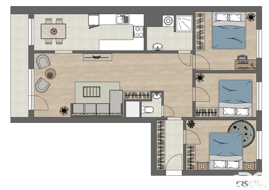 Na chladnější severní straně jsou umístěny všechny tři ložnice. Na jižní straně se pak nachází prostorný obývací pokoj a oddělená kuchyně s jídelnou. Podél obou místností se pak táhne lodžie orientovaná do vnitrobloku. Koupelna a WC jsou řešeny odděleně.