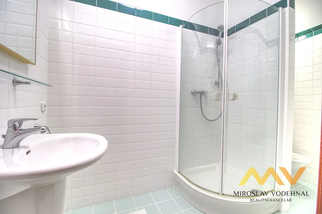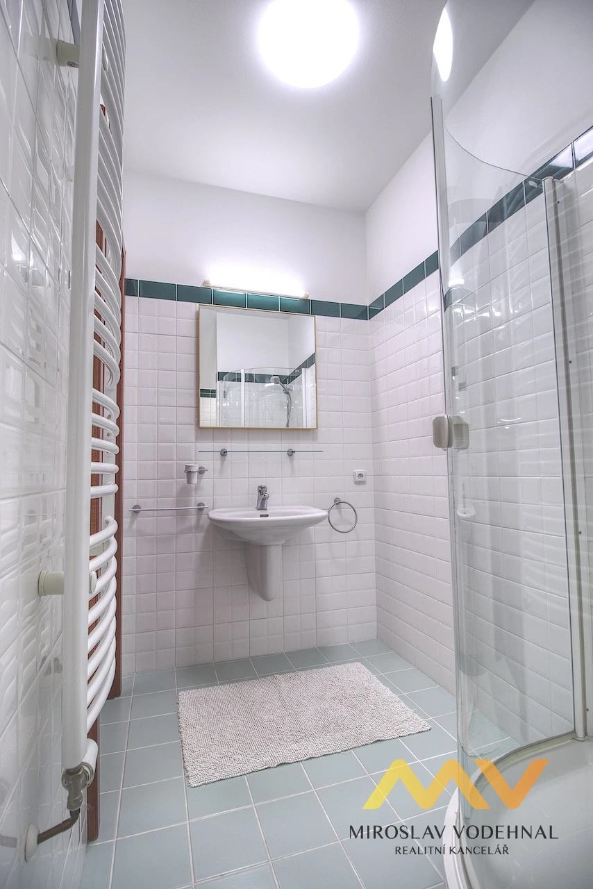 Koupelna je vybavena sprchovým koutem, masážní vanou, pračkou a sušičkou. K dispozici je také prostorná šatna (komora). Podlahy pokrývají koberce a dlažba, a atmosféru bytu dokreslují bodová světla.