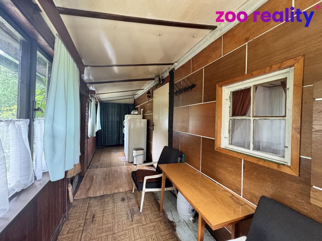 Vstupními dveřmi vejdeme do chaty a stojíme na verandě, ze které vedou dveře do koupelny s toaletou a do obytné části - kuchyně a pokoje a dále schody vystoupáme do obytného podkroví, které poskytuje dostatek prostoru pro spaní ve Vašem budoucím víkendovém útočišti. Užitná plocha nemovitosti činí 88 m², což zajišťuje pohodlné a příjemné užívání chaty. Topení je řešeno kamny na tuhá paliva, teplou vodu zajišťuje elektrický bojler.