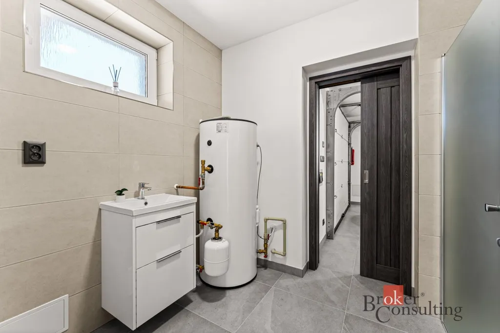 = 1 x pokoj, 1x obývací pokoj s 1x kuchyňský kout zde je jižní orientace, dvě francouzská okna, 1x technická místnost se sprchovým koutem, umyvadlem, samostatná toaleta s umyvadlem, komora u kuchyně, chodba a schodiště, prostorná garáž 23,29 m² s možností dodělání dílenského koutu, nad celou plochou garáže se nachází půda, kde je uložena rekuperace a zbytek prostoru je vhodné využít pro uskladnění věcí
