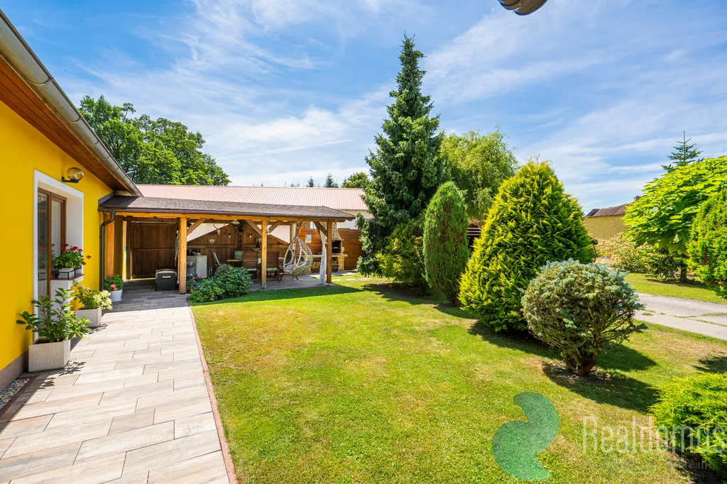 Venkovní posezení s krbem, 2 x přístřešek na vozidla, studna, příjezdová brána do objektu na el. ovládání.