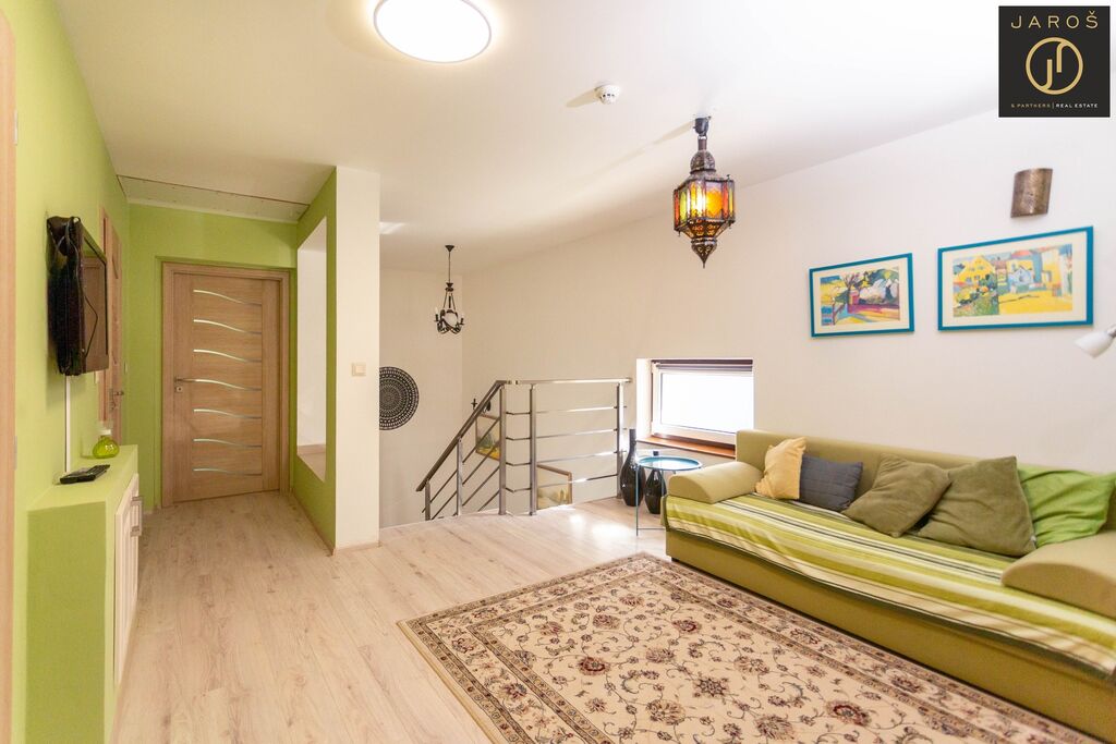 V 1.patře jsou další 2 ložnice, z nichž jedna má svůj balkon, opět koupelna s WC, pracovna a odpočinková chodba s posezením a TV.