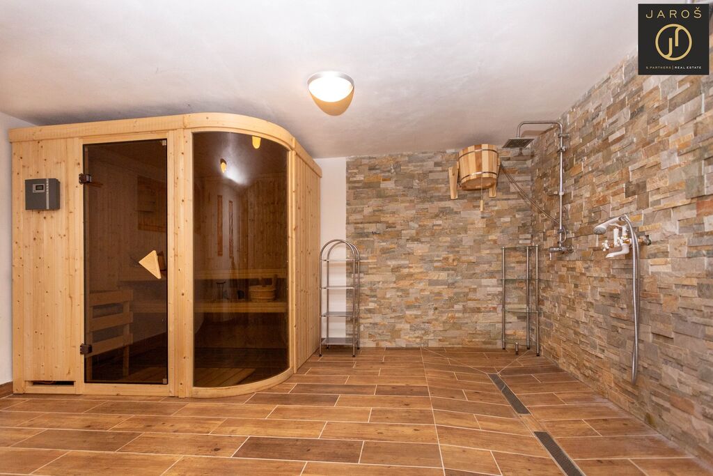 V suterénu domu se nachází technická místnost s tepelným čerpadlem zn. Mastertherm zajišťující podlahové vytápění domu a ohřev vody, praktická prádelna s umyvadlem a WC, místnost se saunou a s ní sousedící velký relaxační pokoj s TV.