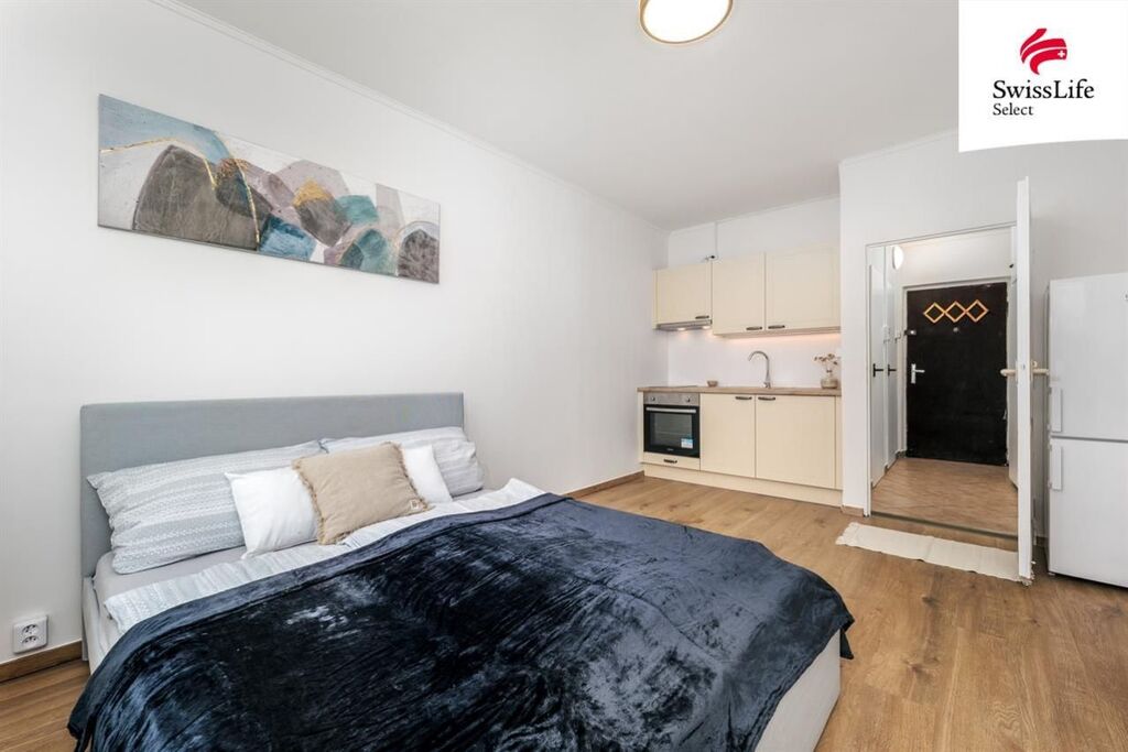 Praha 10 Strašnice, ulice Tuklatská, 13.patro revitalizovaného panelového domu s výtahem a zařízený byt 1+kk. Krásný výhled na široké okolí.