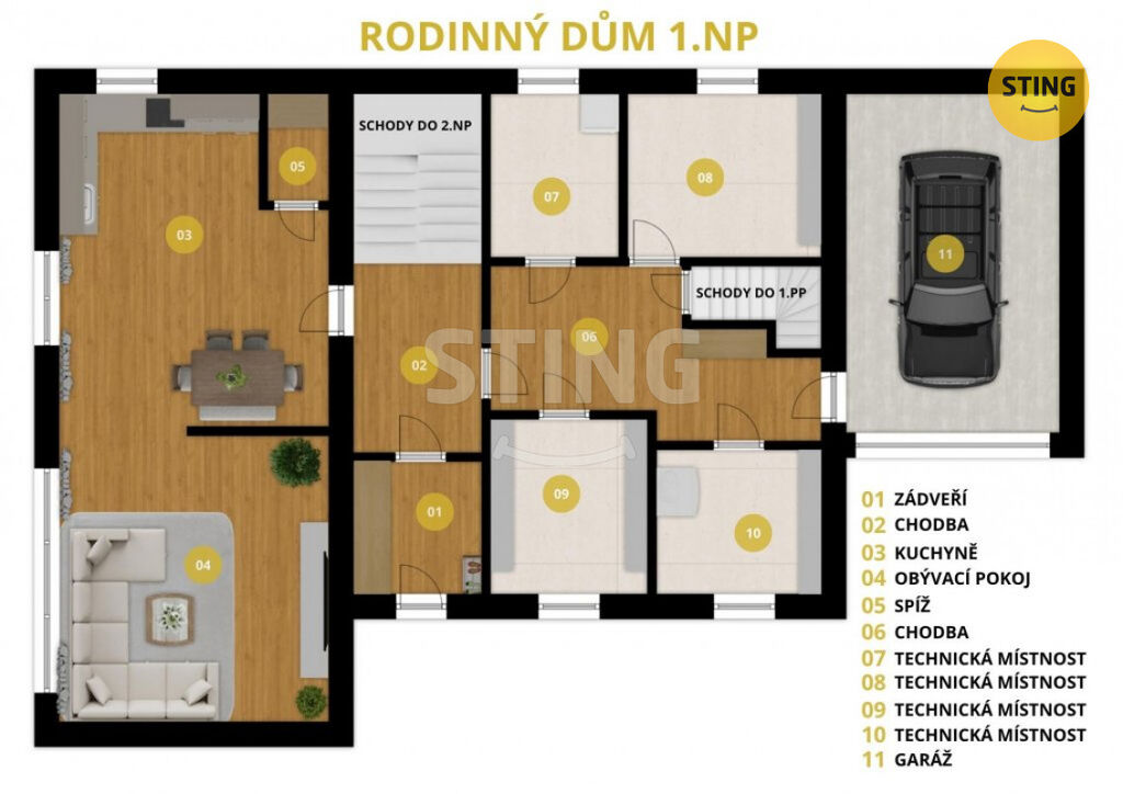V přízemí se nachází kuchyně propojená s obývacím prostorem a vstupem na zahradu, čtyři technické místnosti a garáž.