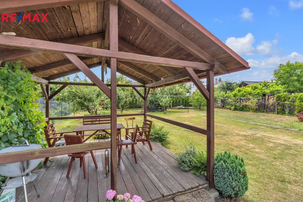 Na udržované zahradě najdete zděnou garáž, kůlnu, dílnu a pergolu. Díky své velikosti nabízí zahrada dostatek místa pro relaxaci, dětské hry i zahradničení.
