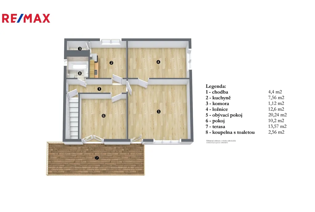 Patro: chodba, kuchyně, obývací pokoj, ložnice, pokoj se vstupem na terasu, koupelna s toaletou