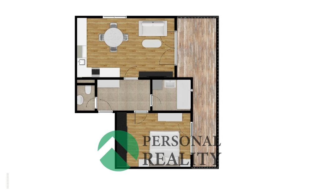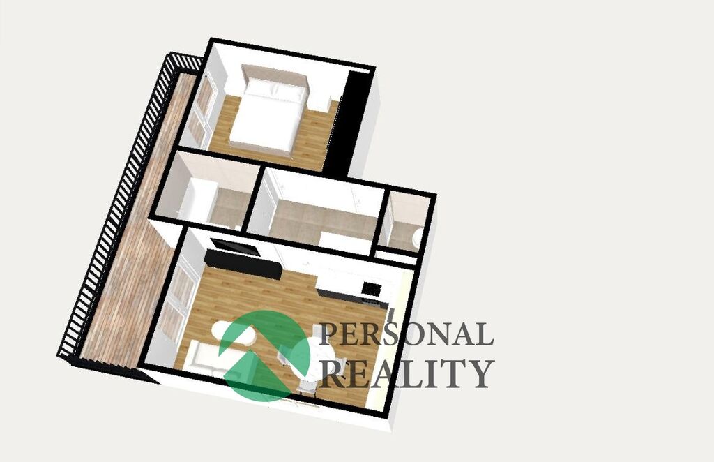 Dispozičně je byt velmi prakticky řešen: Z předsíně máte vstup do každé místnosti, do ložnice, obývacího pokoje, WC a koupelny. Vstup na terasu má jak z obývací pokoje tak i z ložnice.