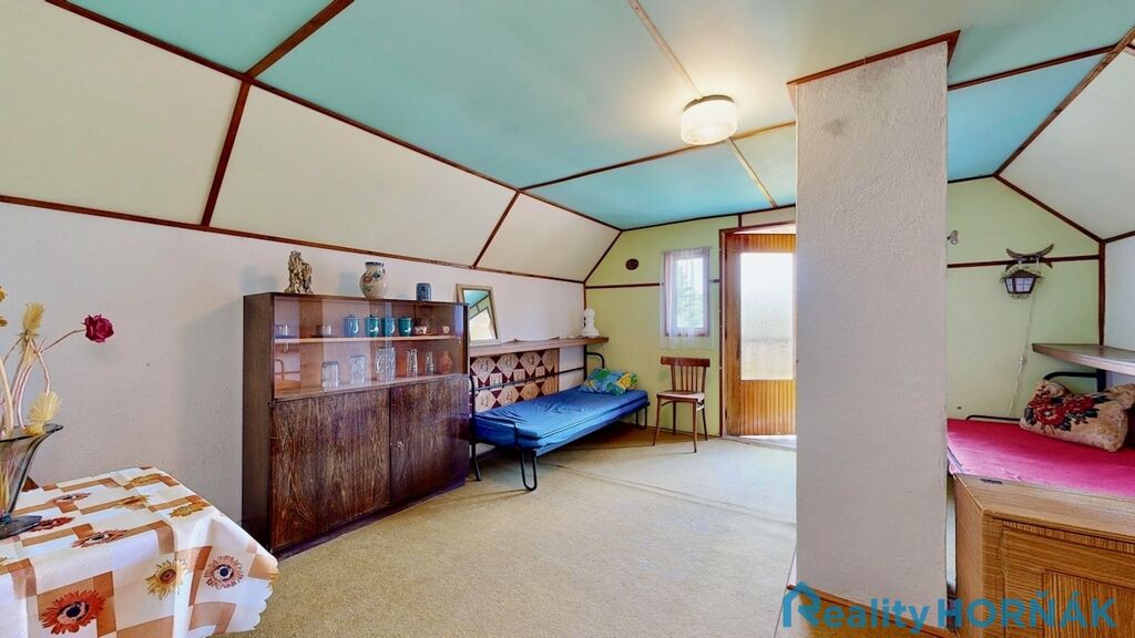 Po dřevěném schodišti vystoupáme do podkrovní předsíňky (5,6 m²) a dále do ložnice (16,8 m²) s předloženým balkonem (6,8 m²). Ze zahrady je přístupný sklep (12,2 m²).