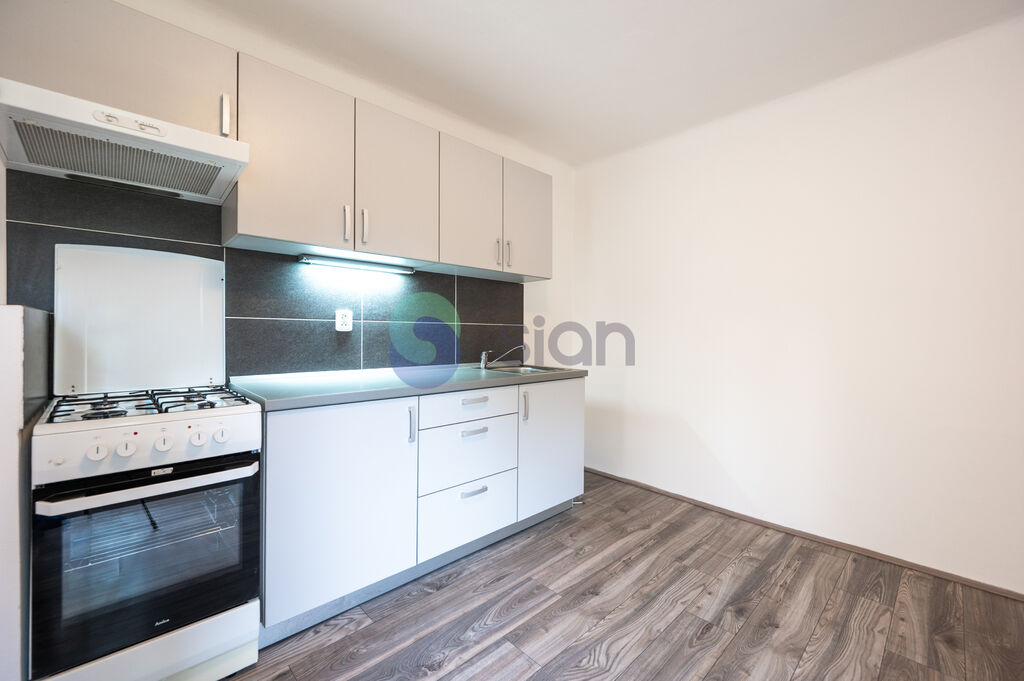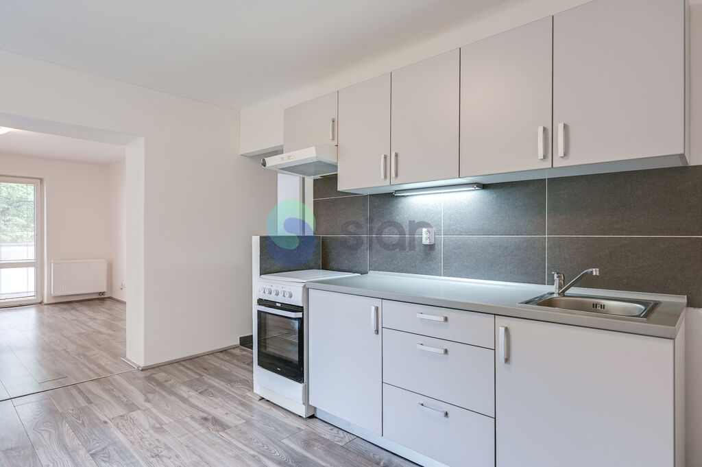 Dispozice bytu: prostorná kuchyně je propojena širokým průchodem s obývacím pokojem, odkud francouzské okno vede přímo na lodžii. Druhý pokoj – ložnice – je neprůchozí. Koupelna je vybavena vanou, toaletou, topným žebříkem a plynovým kotlem, nechybí ani příprava na pračku. Mezi fotografiemi najdete i vizualizace, pro představu zařízeného bytu.