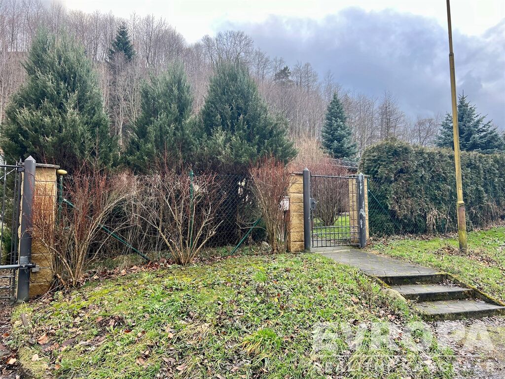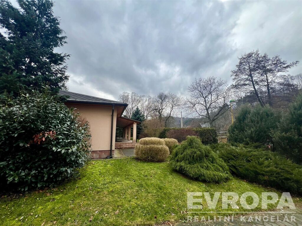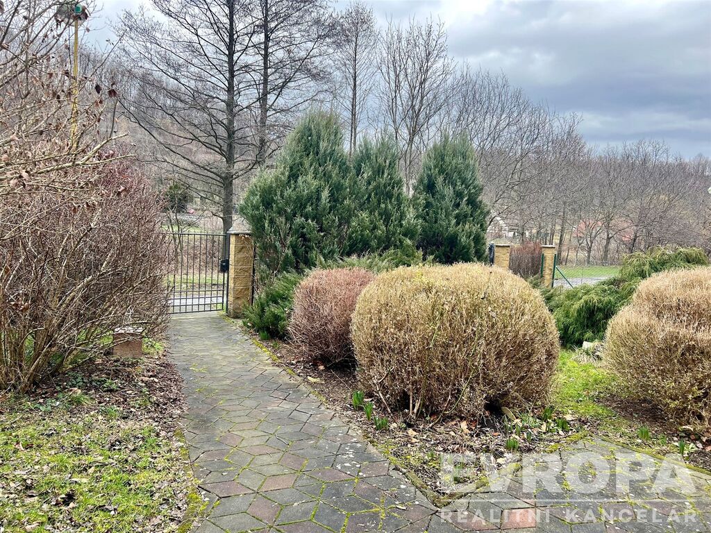 Zahrada je upravená se vzrostlými okrasnými dřevinami. Na pozemek lze vstoupit brankou nebo vjet bránou s elektronickým otevíráním.