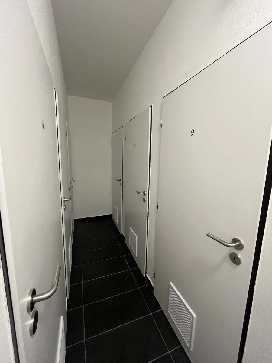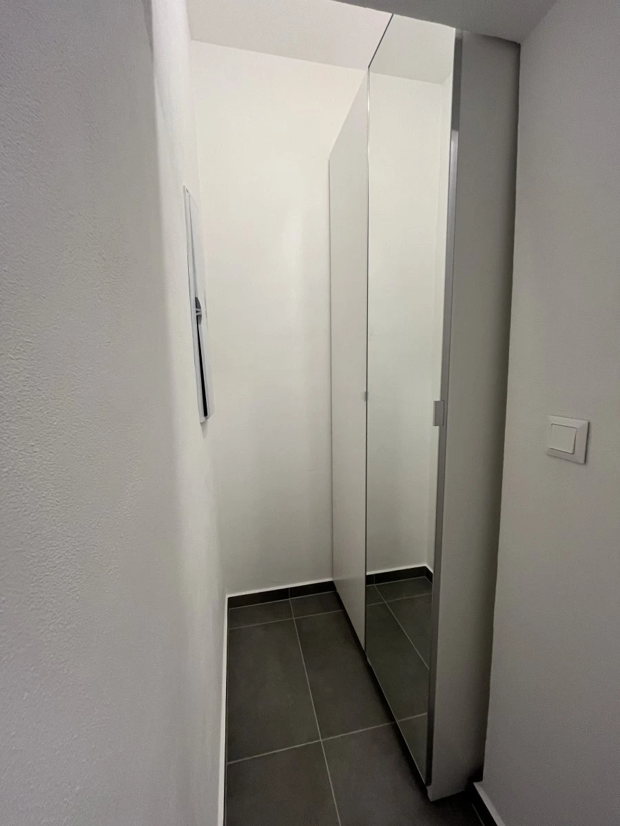 Dispozice nabízí koupelnu s umyvadlem, sprchovým koutem, vysokými skříňkami jako vhodný úložný prostor a toaletu. Na chodbě se nachází šatní skříň sloužící k ukládání bund a obuvi.