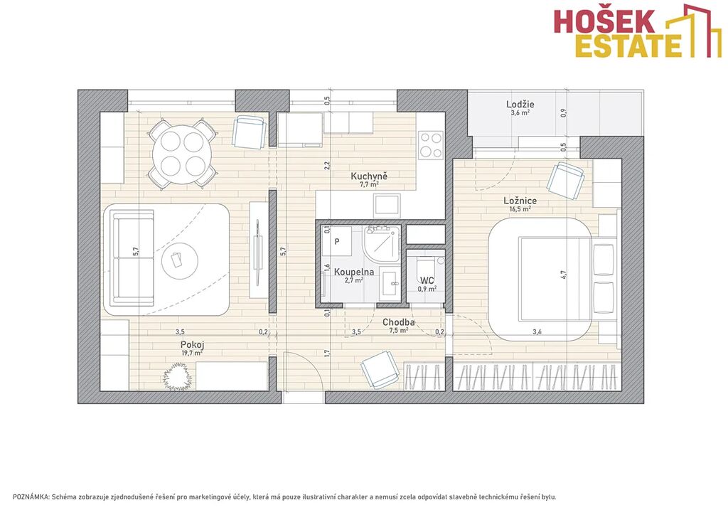 Dominantou bytu je prostorný obývací pokoj o velikosti 17m², který je průchozí s kuchyní. V kuchyni se nachází moderní kuchyňská linka. Velkou výhodou bytu je také ložnice s lodžií, kde si můžete vychutnat ranní kávu nebo relaxovat.