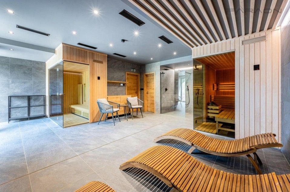 Apartmán tvoří prostorný obývací pokoj s přípravou na kuchyňskou linku a přímým vstupem na balkon skrze velkoformátová francouzská okna, samostatná ložnice rovněž se vstupem na balkon, dále koupelna se sprchovým koutem a toaletou. K využití špičkové zázemí  wellness se saunou a vířivkou, posilovna, společenská místnost, lyžárna, kolárna.