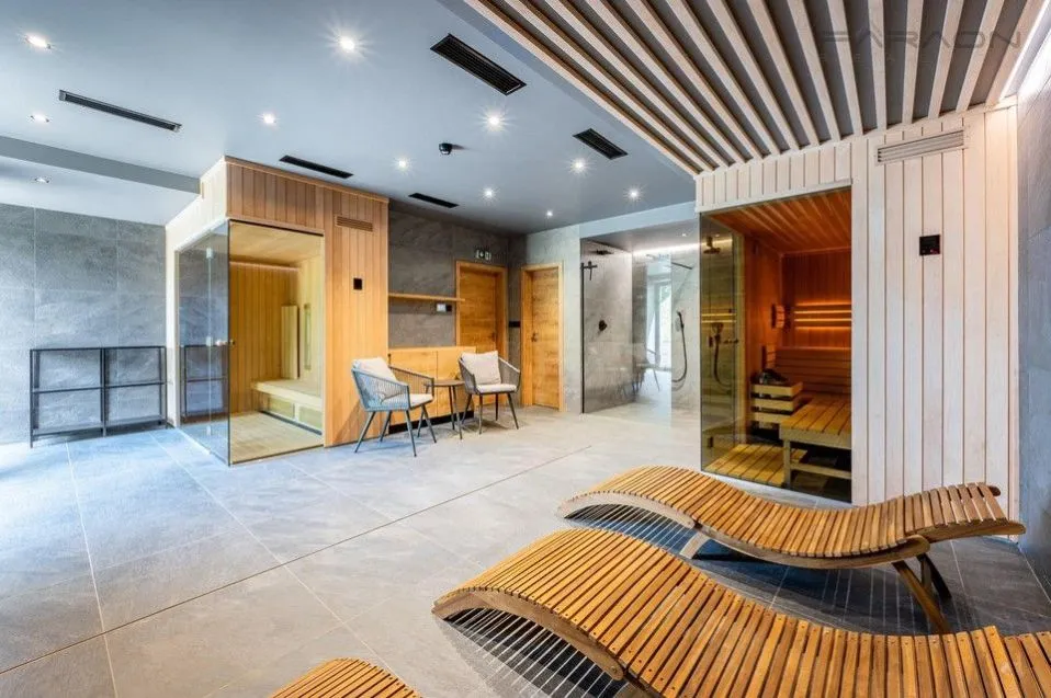 Apartmán tvoří prostorný obývací pokoj s přípravou na kuchyňskou linku a přímým vstupem na balkon skrze velkoformátová francouzská okna, samostatná ložnice rovněž se vstupem na balkon, dále koupelna se sprchovým koutem a toaletou. K využití špičkové zázemí wellness se saunou a vířivkou, posilovna, společenská místnost, lyžárna, kolárna.